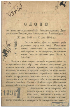 Архангельский Николай Михайлович. Слово в день пятидесятилетия Нижегородского Дворянского Института императора Александра II : (30 августа 1844 г. - 30 августа 1894 г.) / Н. Архангельский. — Нижний Новгород : [б. и.], [1894] г. — 7 с. ; 22 см.