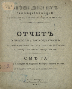 Нижегородский Дворянский институт им. Императора Александра II. Отчёт о приходе и расходе сумм по содержанию института и пансиона при нем, с 1 октября 1889 года по 1 октября 1890 года ; Смета доходам и расходам по содержанию института и пансиона при нем, с 1 октября 1890 года по 1 октября 1891 года . — Нижний Новгород : Тип. т-ва А. Ржонсницкого, 1890 г. — 4, 4, 6 с. ; 27 см.