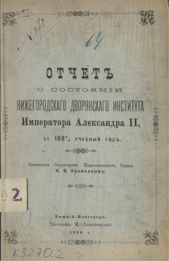 Отчет о состоянии Нижегородского дворянского института императора Александра II.... — Нижний Новгород : Тип. И. Соколенкова, [1886-] г. ... за 1884/5 учебный год / сост. Н. К. Кремковым. — 1886 г. — 63 с.