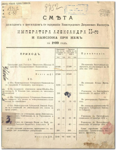 Нижегородский дворянский институт им. императора Александра II. Смета доходам и расходам по содержанию Нижегородского дворянского института императора Александра II и пансиона при нем.... — Нижний Новгород : Типо-литогр. И. М. Машистова, 1894- г. ... на 1899 год. — Нижний Новгород : Типо-литогр. В. Ройского и С. Душина, 1899 г. — 7 с.